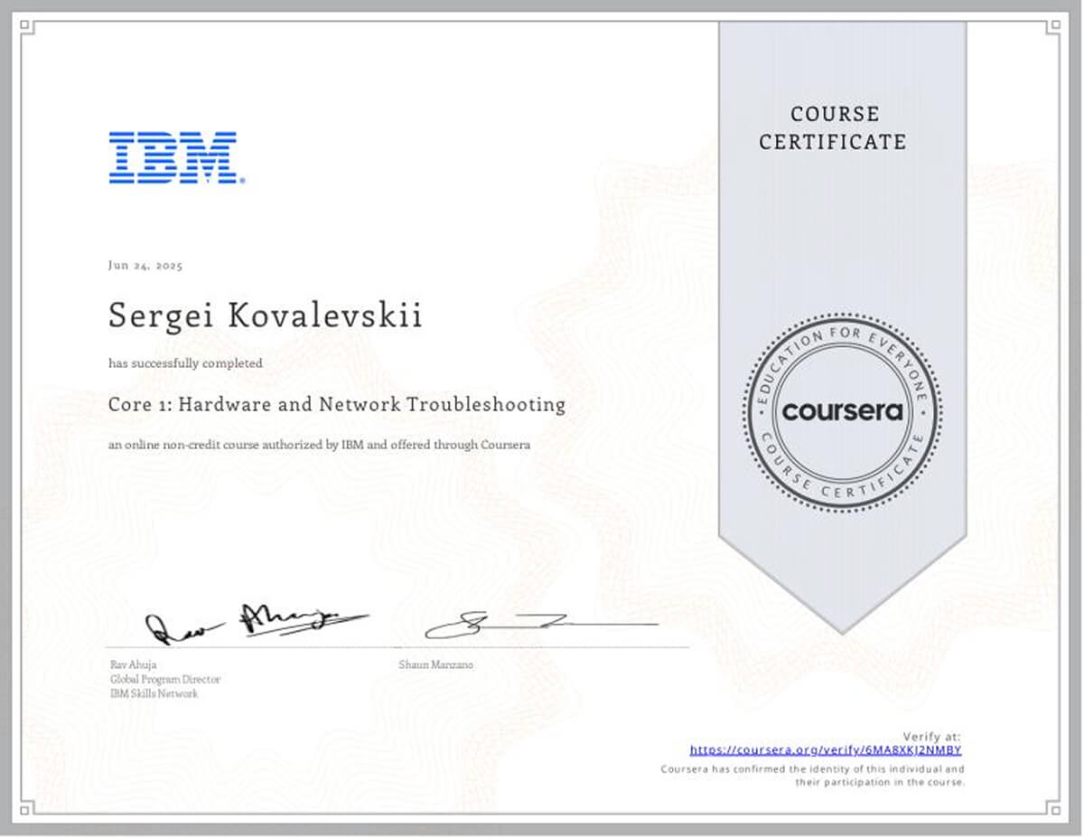 Skills were developed through continuous hands-on work with real systems. This results in deeper understanding and faster resolution than scripted or purely theoretical approaches.